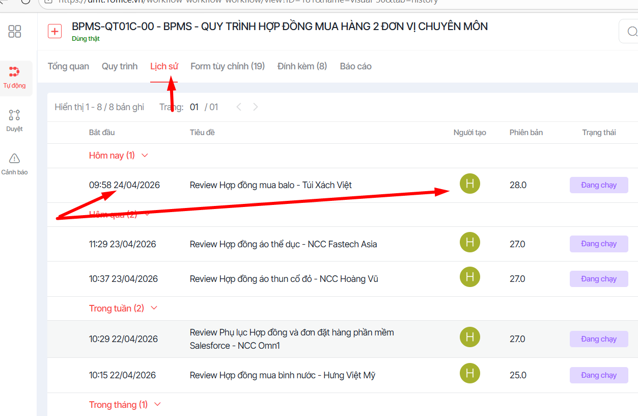 Bước 8: Vào Tự động --> chọn quy trình áp dụng --> lịch sử để xem lại phiên bản áp dụng quy trình.