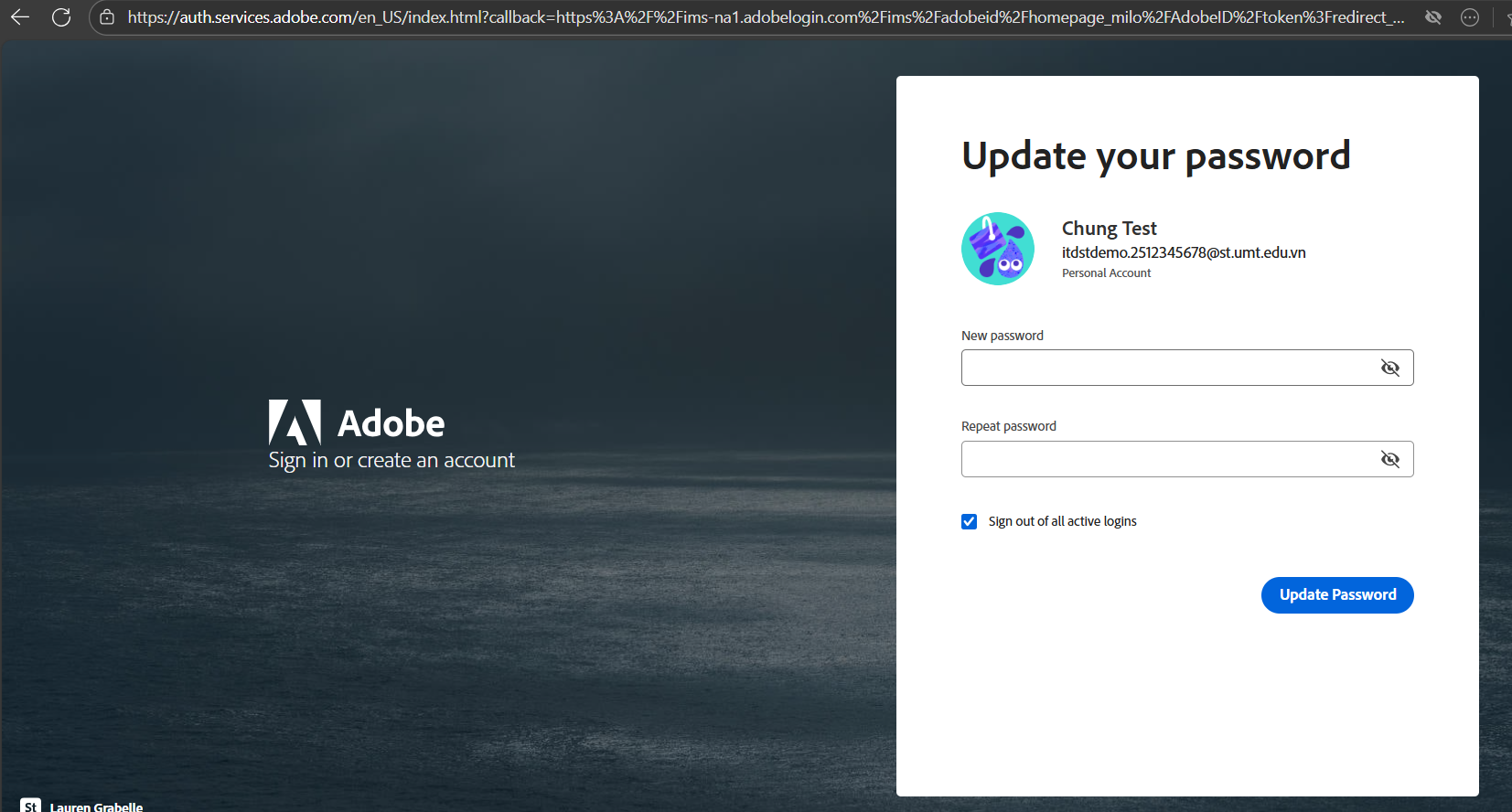 Bước 6: Gõ mật khẩu mới --> chọn Update Password.