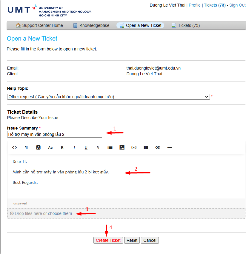 Bước 4: Người dùng đặt tiêu đề cho ticket cần hỗ trợ, ví dụ: Hỗ trợ máy in lầu 2 tại ô Issue Summary (1). Ô nội dung (2) người dùng cần mô tả chi tiết vấn đề cần hỗ trợ, và đính kèm hình ảnh, video nếu có (3). Sau khi hoàn tất, người dùng chọn Create Ticket (4) để gửi thông tin cần hỗ trợ cho phòng IT tiếp nhận xử lý.