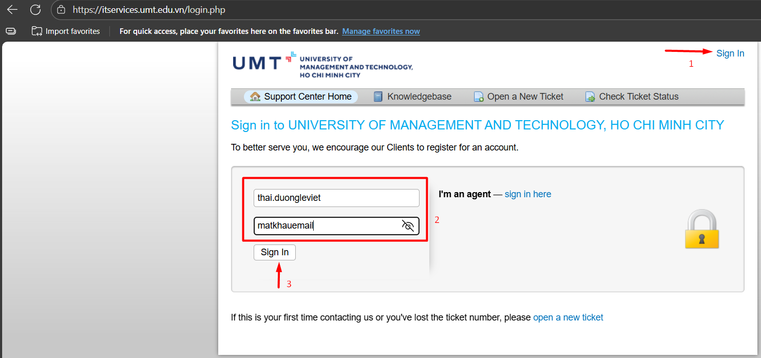 Bước 1: Người dùng truy cập vào hệ thống OsTicket bằng link https://itservices.umt.edu.vn . Chọn Sign In, Username là email của người dùng nhưng bỏ @umt.edu.vn, mật khẩu là mật khẩu email của người dùng