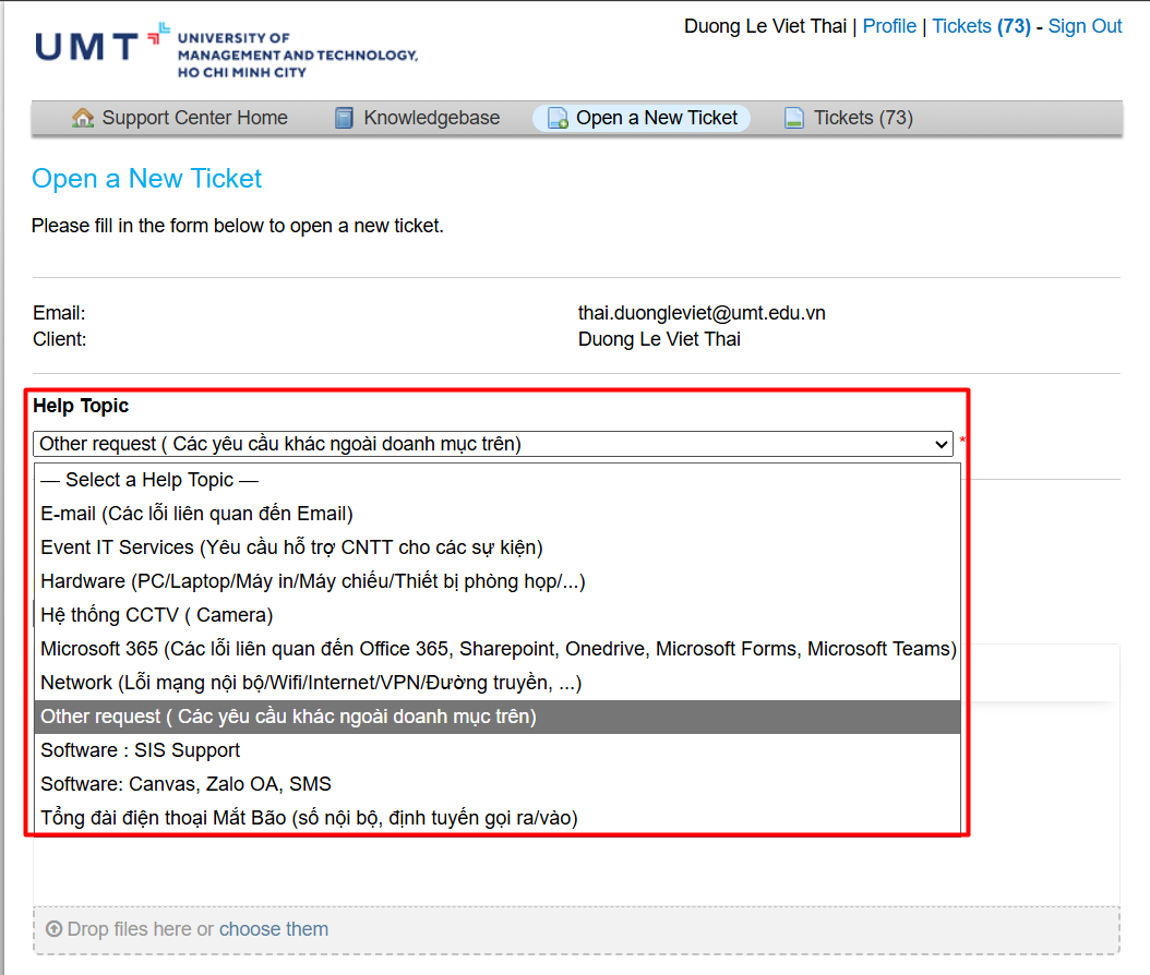 Lưu ý: Trường hợp người dùng không rõ vấn đề cần hỗ trợ của mình thuộc danh mục nào thì chọn Help topic là Other Requests