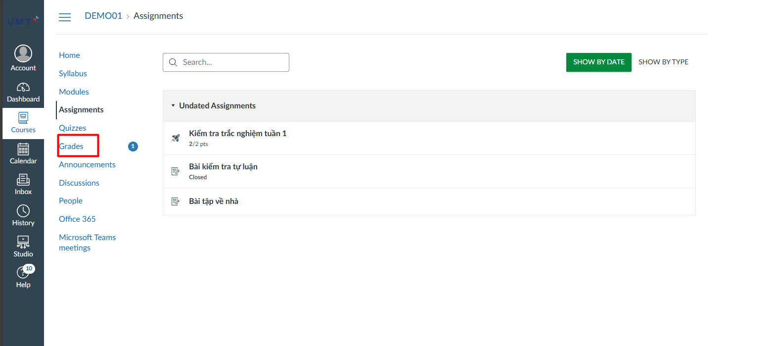 Bước 1: Sinh viên truy cập vào môn học cần xem điểm và chọn Grades