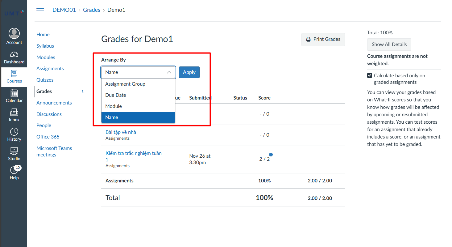 Bước 2: Sinh viên có thể chọn hiển thị để lọc theo Due date, Module, Name Hoặc Assignment Group (Bài tập nhóm) và chọn Apply