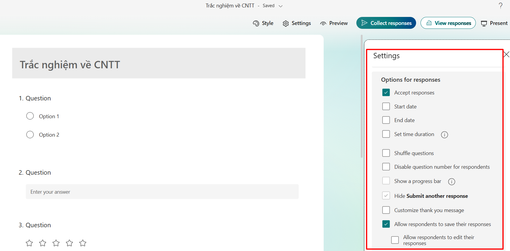 - Shuffle questions: Sắp xếp câu hỏi theo thứ tự ngẫu nhiên mỗi lần vào Form.