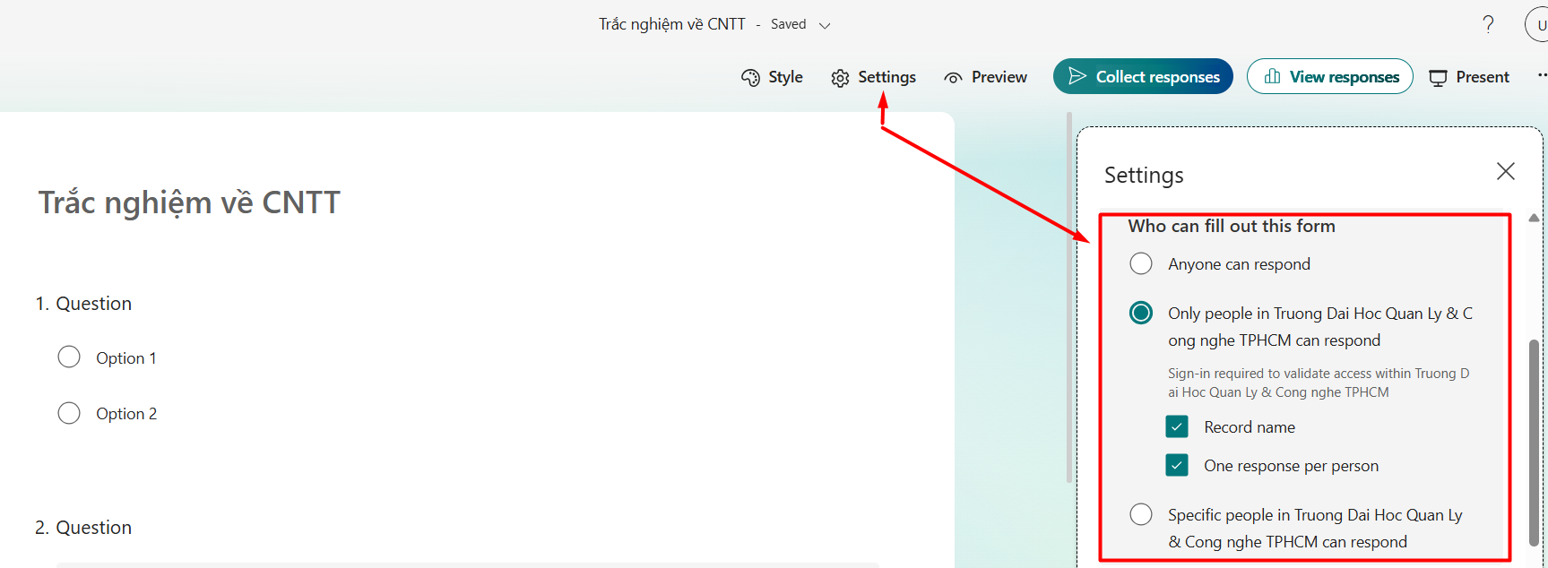 chọn Only people in my organization can respond là người trong tổ chức có email @st.umt.edu.vn.