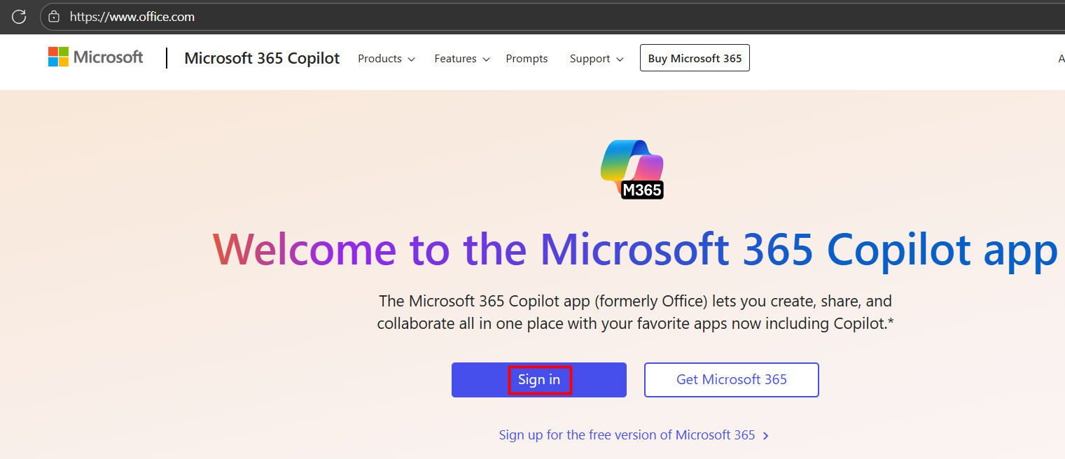Bước 1: Mở trình duyệt truy cập vào link https://office.com chọn Sign in để đăng nhập bằng tên tài khoản và mật khẩu đã được cấp.