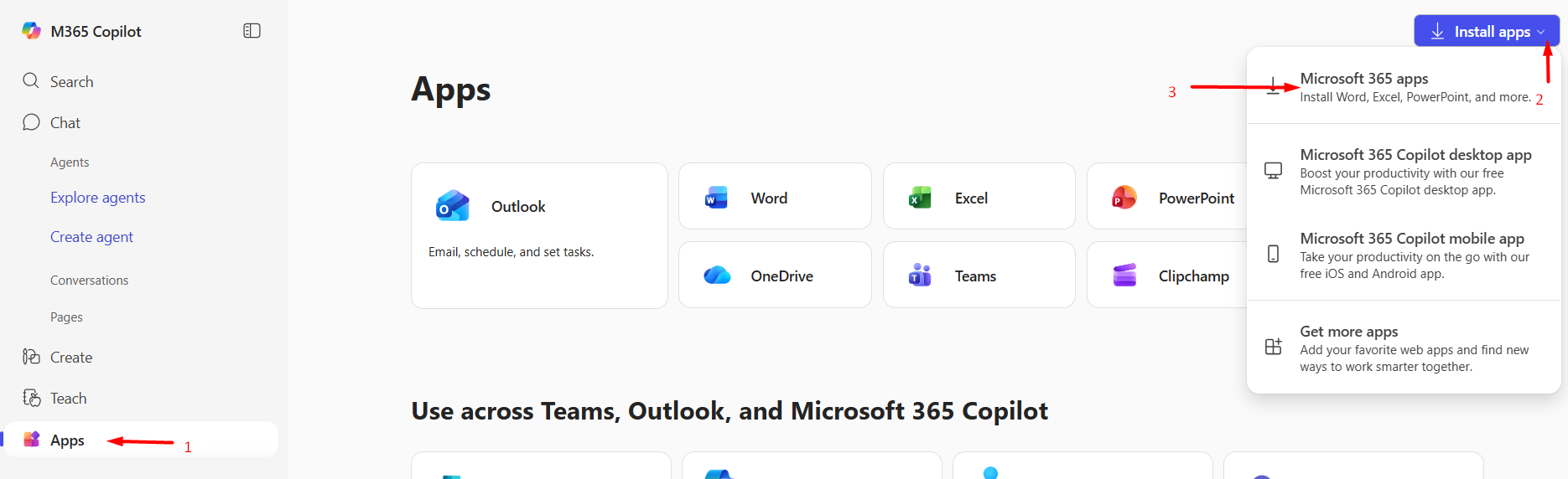 Bước 2: Chọn Apps --> chọn Install apps --> chọn Microsoft 365 apps