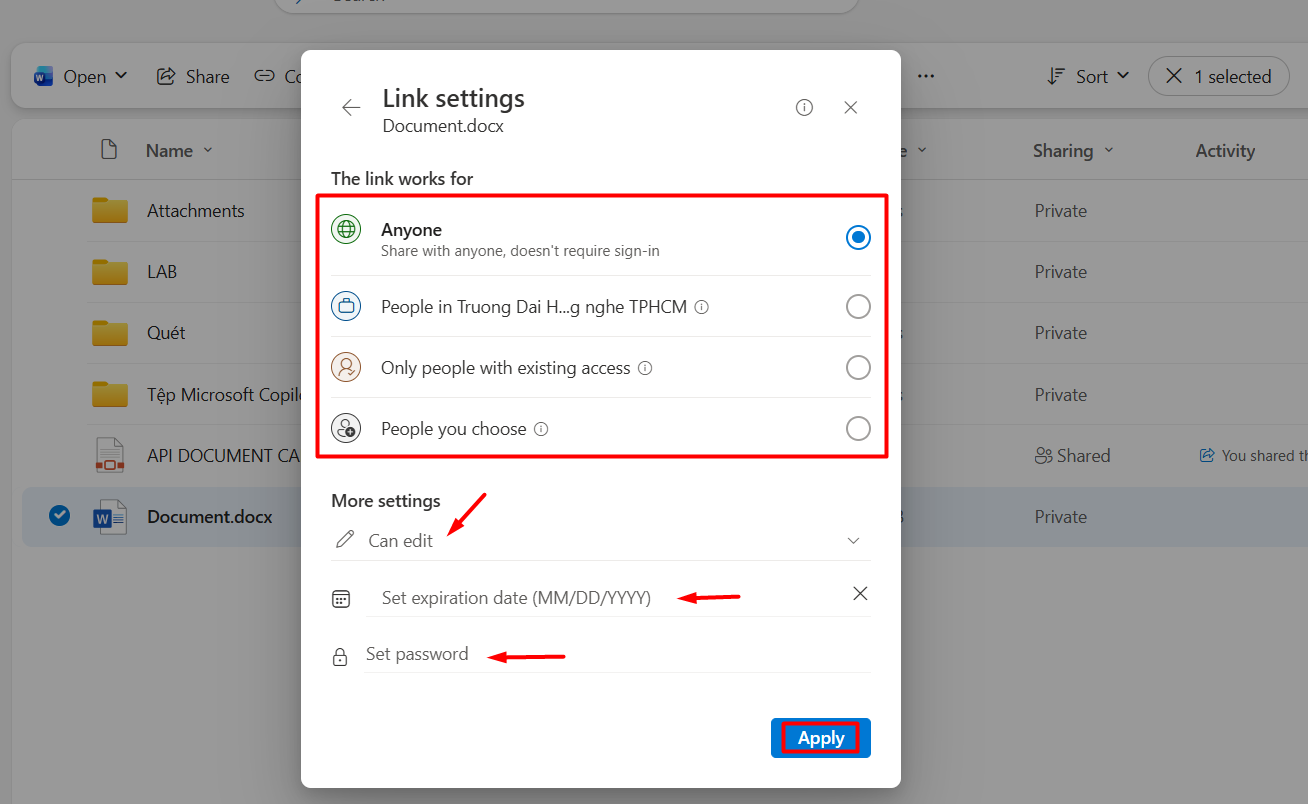 - Cài đặt thời gian hết hạn của link chia sẻ