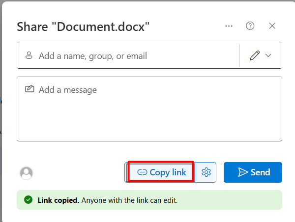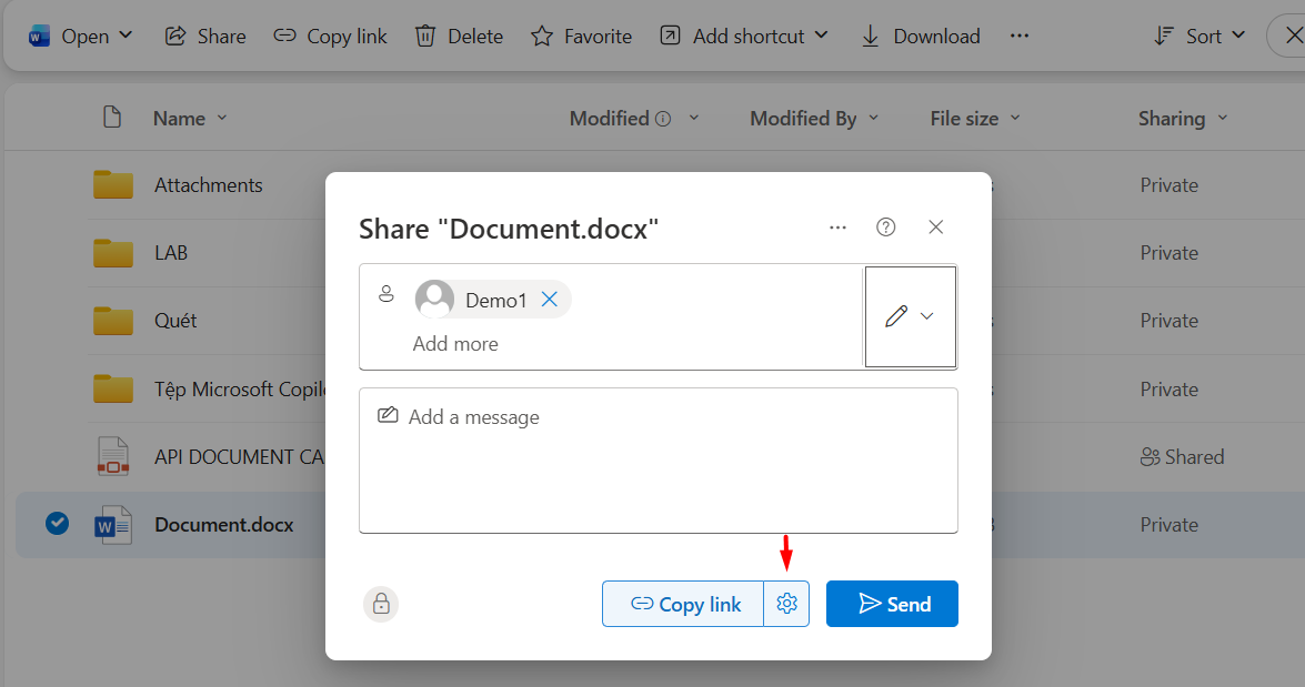 Bước 3: Chọn Send để gửi đến người cần chia sẻ. Trường hợp muốn chia sẻ cho tất cả mọi người không cần đăng nhập thì chọn biểu tượng cài đặt như hình bên dưới.