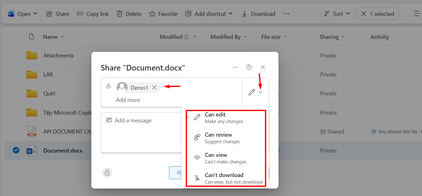 Bước 2: Điền email của người muốn chia sẻ tập tin hoặc thư mục --> phân quyền truy cập vào tập tin hoặc thư mục