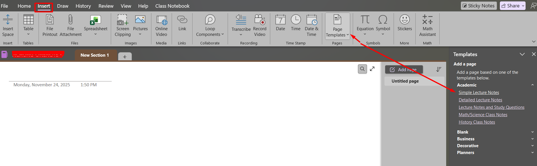 Bước 4: Mặc định section mới là trang trắng, nếu thích trang trí có thể chọn các mẫu có sẵn trong một trang mới bằng cách chọn Insert -> Page Templates.