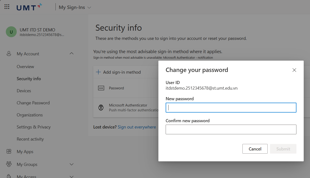 Bước 4: Nhập mật khẩu với --> chọn Submit để hoàn tất thay đổi mật khẩu.