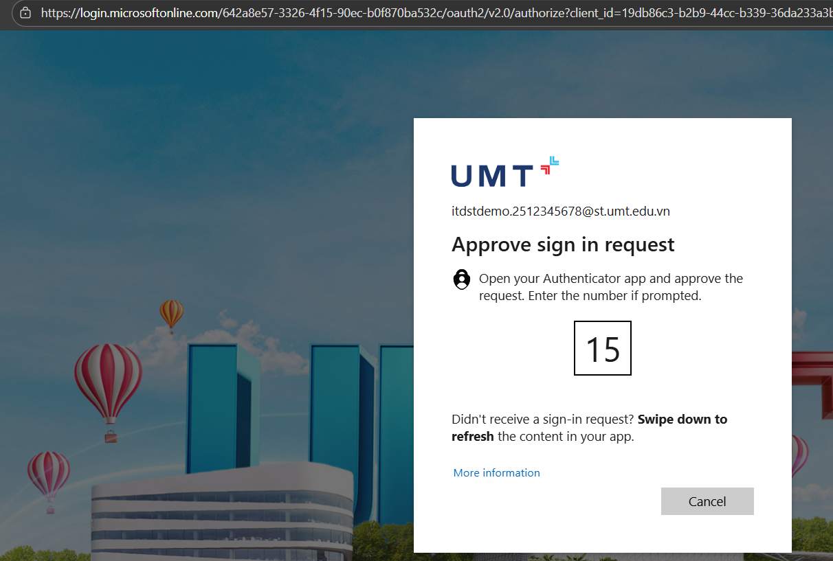 Bước 3: Hệ thống yêu cầu xác thực qua Microsoft Authenticator --> Mở ứng dụng Microsoft Authenticator trên điện thoại và nhập số hiển thị trên trình duyệt.