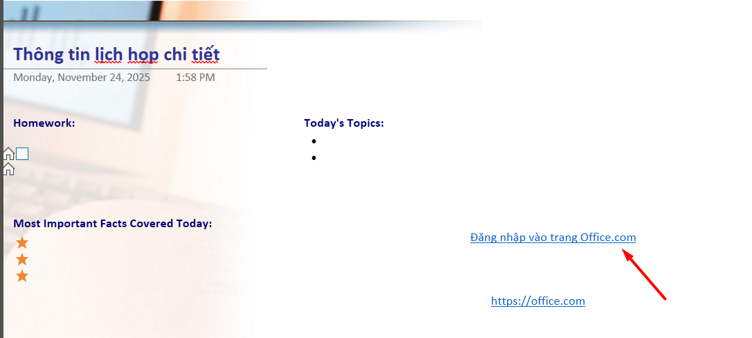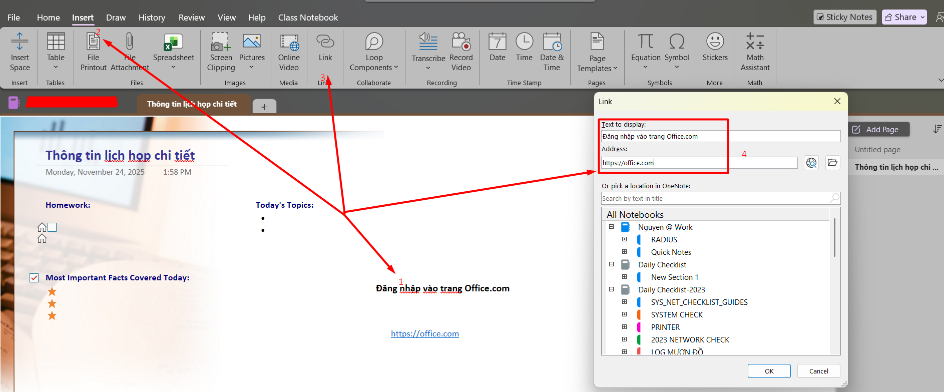 Thêm liên kết (link) vào ghi chú: khi gõ một đoạn văn bản mà OneNote nhận ra dưới dạng một liên kết thì nó sẽ tự động định dạng như một đường link. Ví dụ như khi nhập https://office.com vào ghi chú, OneNote sẽ chuyển thành một kết nối, khi bấm vảo kết nối này sẽ mở trang web Office trong trình duyệt. Có thể thêm link vào trong phần ghi chú (bao gồm cả chữ, hình ảnh, đến những trang khác và section) với các bước như sau: