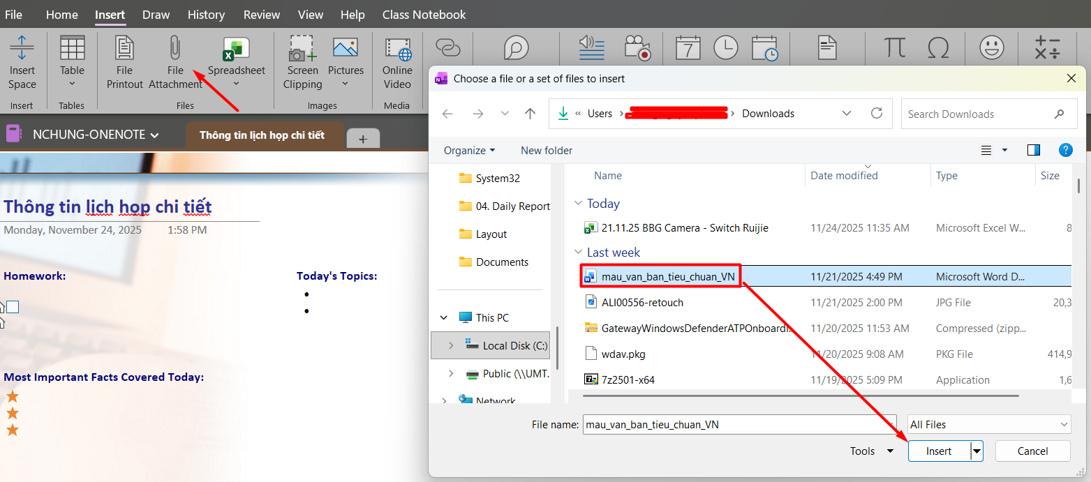 Bước 1: Thêm tập tin vào ghi chú chọn Insert --> File Attachment --> chọn file cần đính kèm --> Insert.