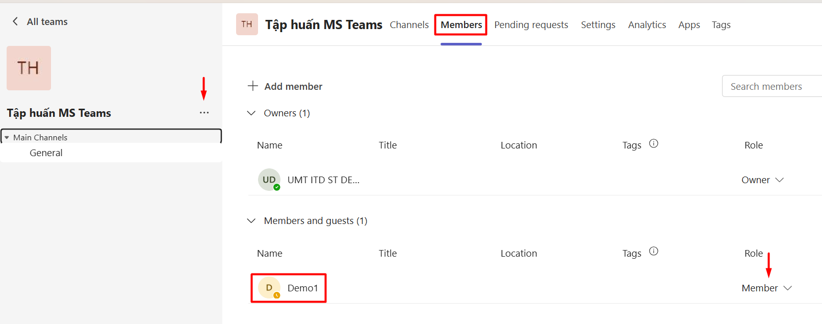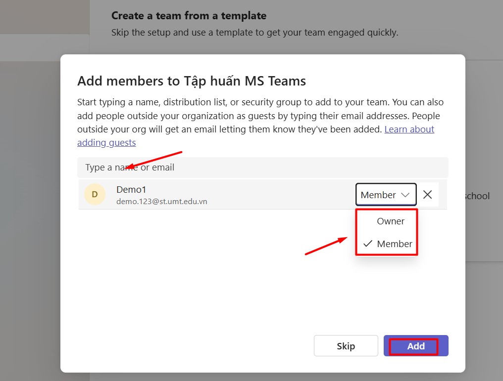 Bước 2: Chọn thành viên tham gia vào nhóm --> nhập email @st.umt.edu.vn --> chọn tài khoản cần thêm vào nhóm --> Add