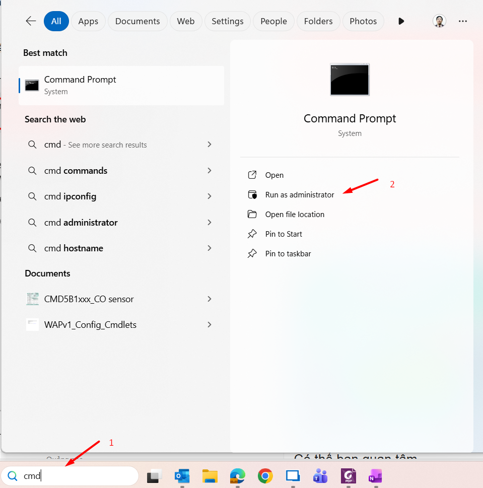 Bước 1: Tại giao diện trên máy tính bạn nhập từ khóa vào thanh tìm kiếm cmd và chọn Run as administrator