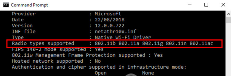 Bước 3: Lúc này bạn sẽ thấy giao diện chạy các dòng thông tin. Khi chạy xong bạn tìm tới dòng thông tin Radio types supported và thấy các tiêu chuẩn kết nối WiFi, nếu: