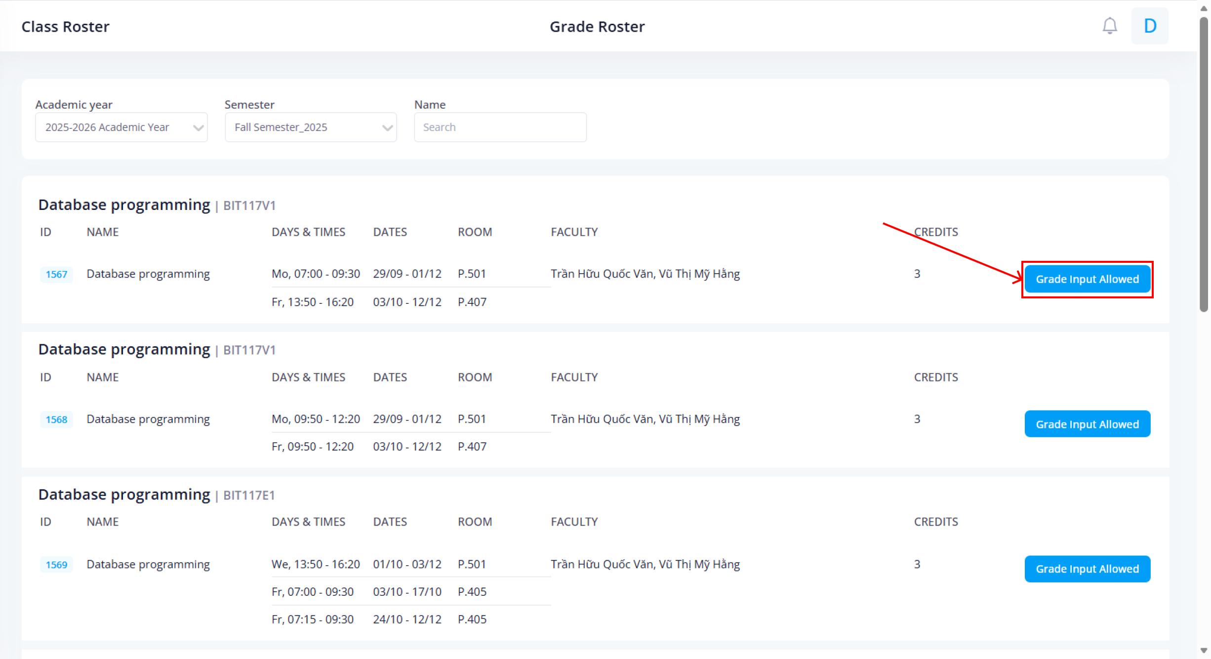 Bước 2: Chọn Grade Input Allowed để điền điểm số của lớp học đang chọn