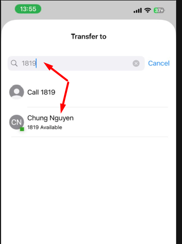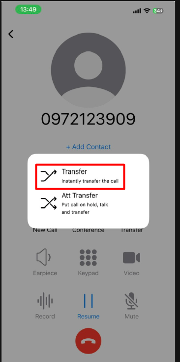 Bước 2: Chọn Transfer để chuyển tiếp cuộc gọi cho số máy nhánh nội bộ.